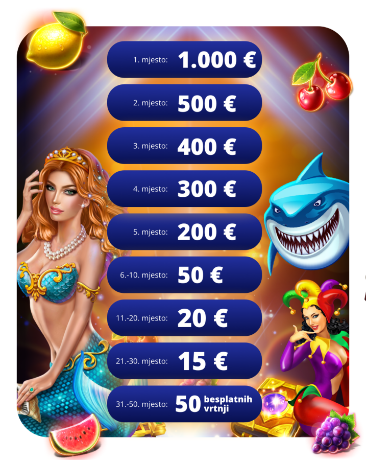 - Automati koji sudjeluju: Allways Hot Fruits, Billyonaire Bonus Buy, Book Of Admiral, Book Of Fruits, Book Of Pharao, Hot Fruits 10, Joker X, Lucky Joker 10 Cashspins, Lucky Shark, Princess Of Pearls.