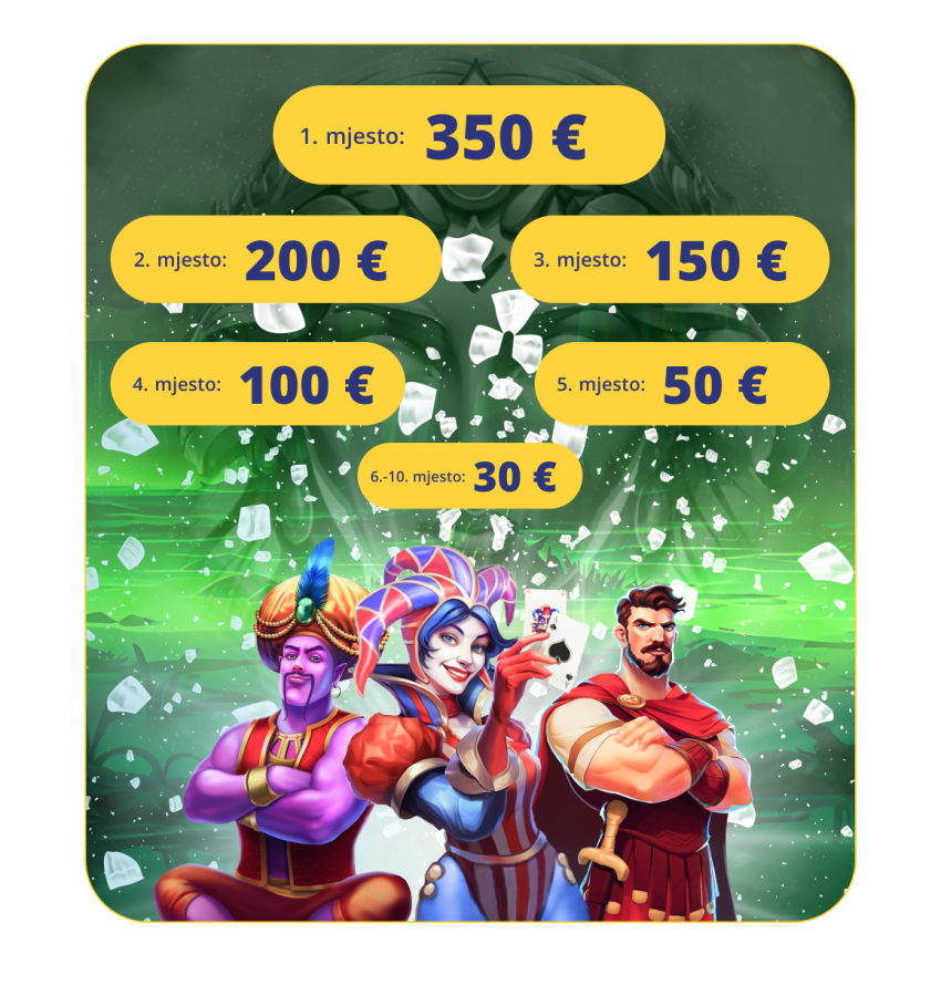 • How to participate: play any of the above slots and win prizes for the top 10 players on the leaderboard. The highest places are occupied by players with the highest total number of bets placed, with only bets of at least €0.50 being counted. For every €1 you make, you get 1 point on the leaderboard.