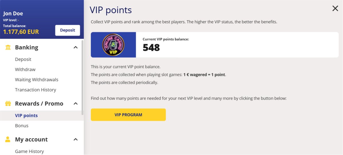• VIP points can only be collected on slot games (slot machines), points are not collected on table games (roulette, keno, blackjack, poker, baccarat, etc.).