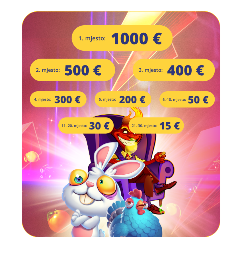 • Kako sudjeluješ: igraj bilo koji od gore navedenih automata i osvoji bonus nagrade za top 30 igrača na ljestvici. Na najviša mjesta uvrštavaju se igrači s najvećim zbrojem postavljenih uloga, pri čemu se broje isključivo ulozi koji su iznosili minimalno 0,50 €. Za svaki postignuti 1 € dobivaš 1 kupon na leaderboardu.